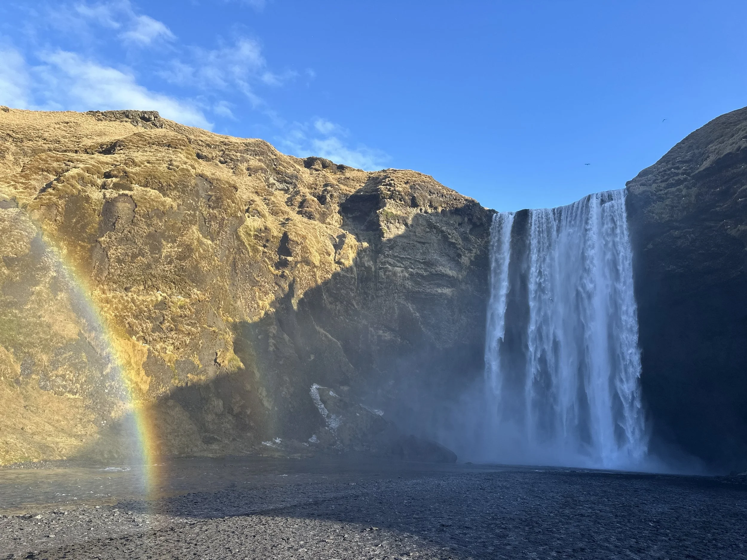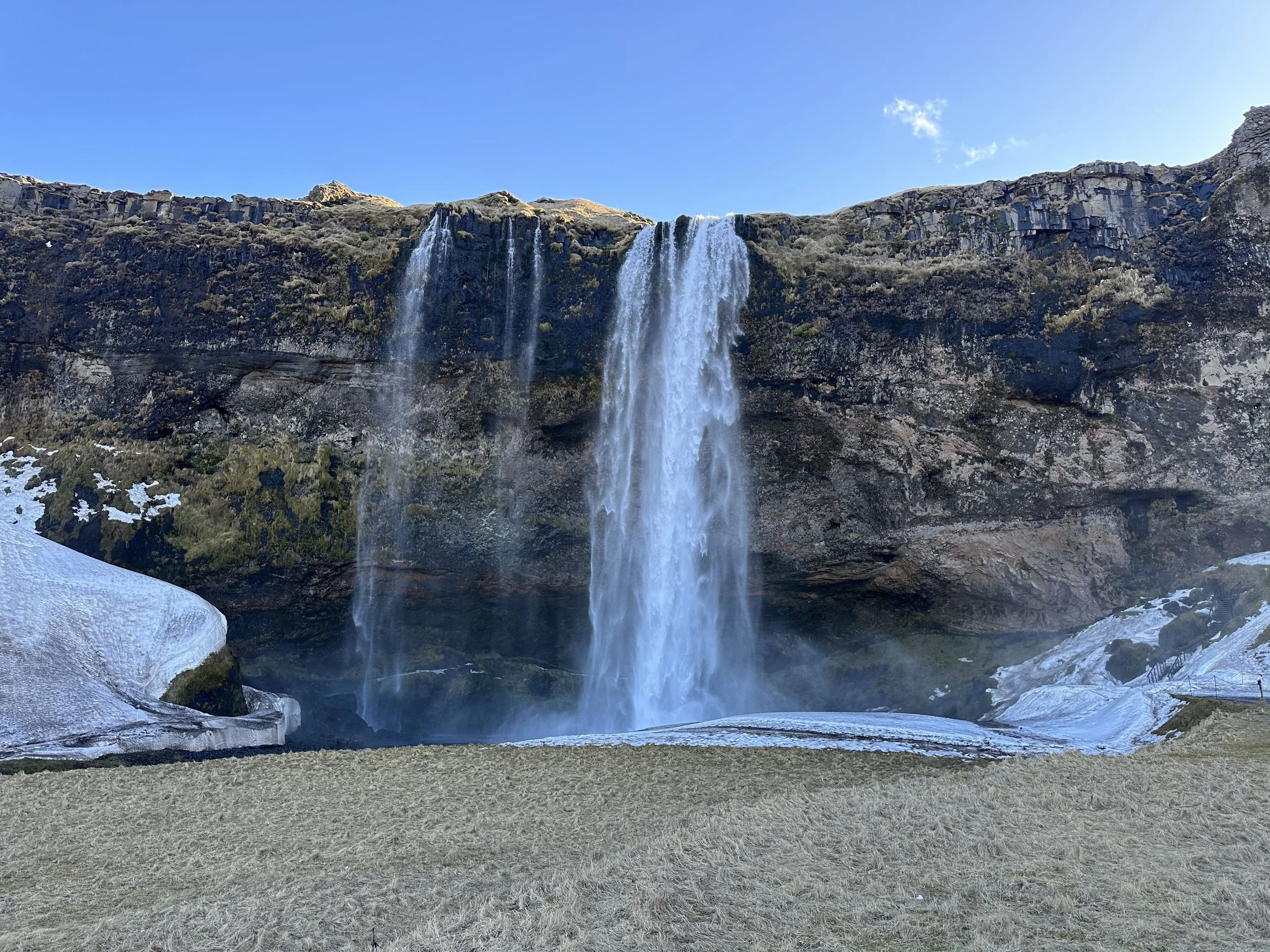 Seljalandsfoss Waterfall – Stop at the picturesque 200ft waterfall, right off the Ring Road, on the way to Vik. (The Ring Road is an 828-mile drive encompassing the entire island.) Give yourself enough time to explore the legendary footpath behind the cascading water – we were in a rush to make our tour in Vik and only took a quick photo.