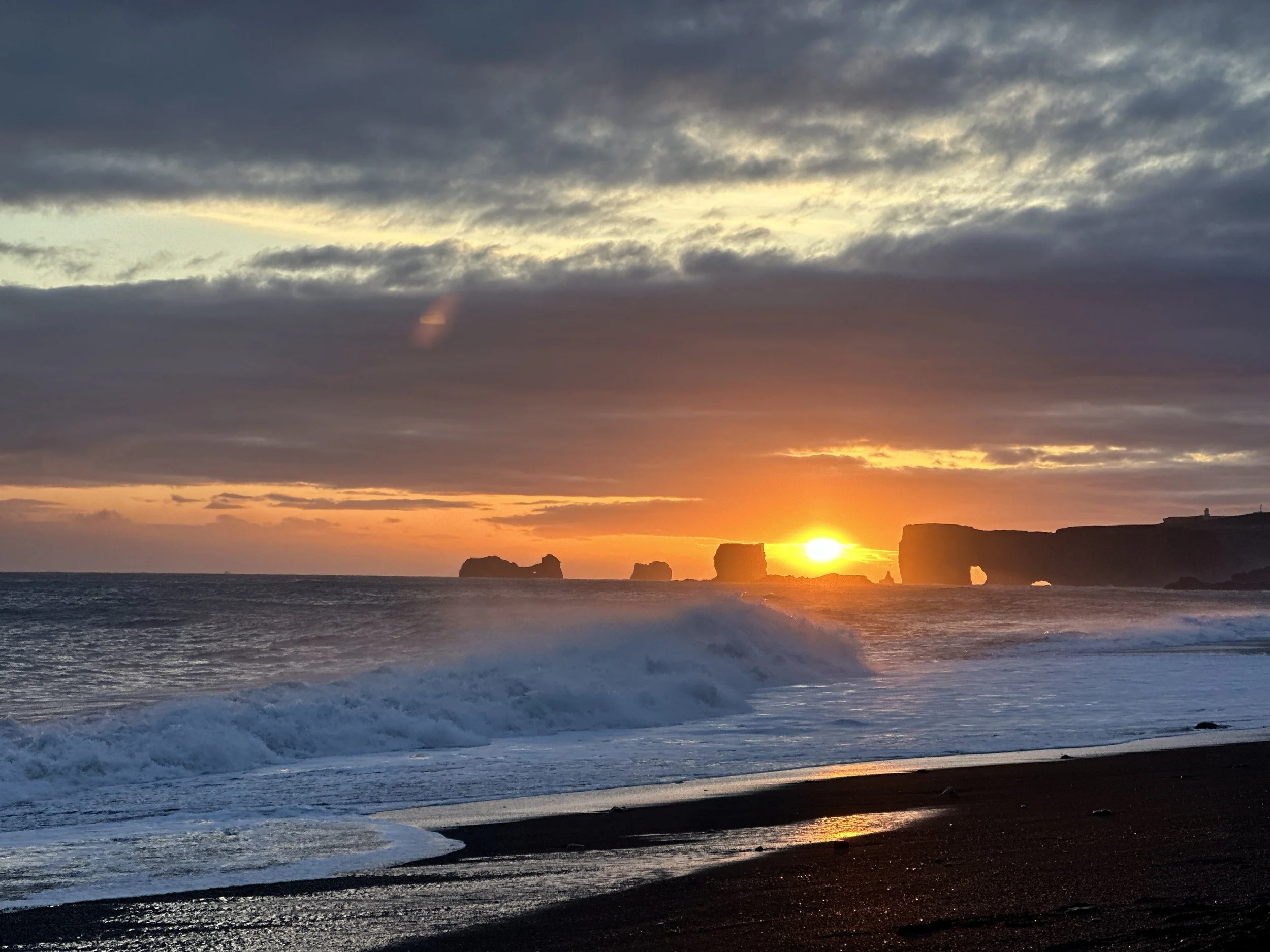 Reynisfjara – Visit this volcanic black-sand beach before sunset and observe the rocky sea stacks (known as the Reynisdrangar) and roaring Atlantic waves. Be mindful of the zone system as the waves have been known to rise to 120 ft and can be dangerous.