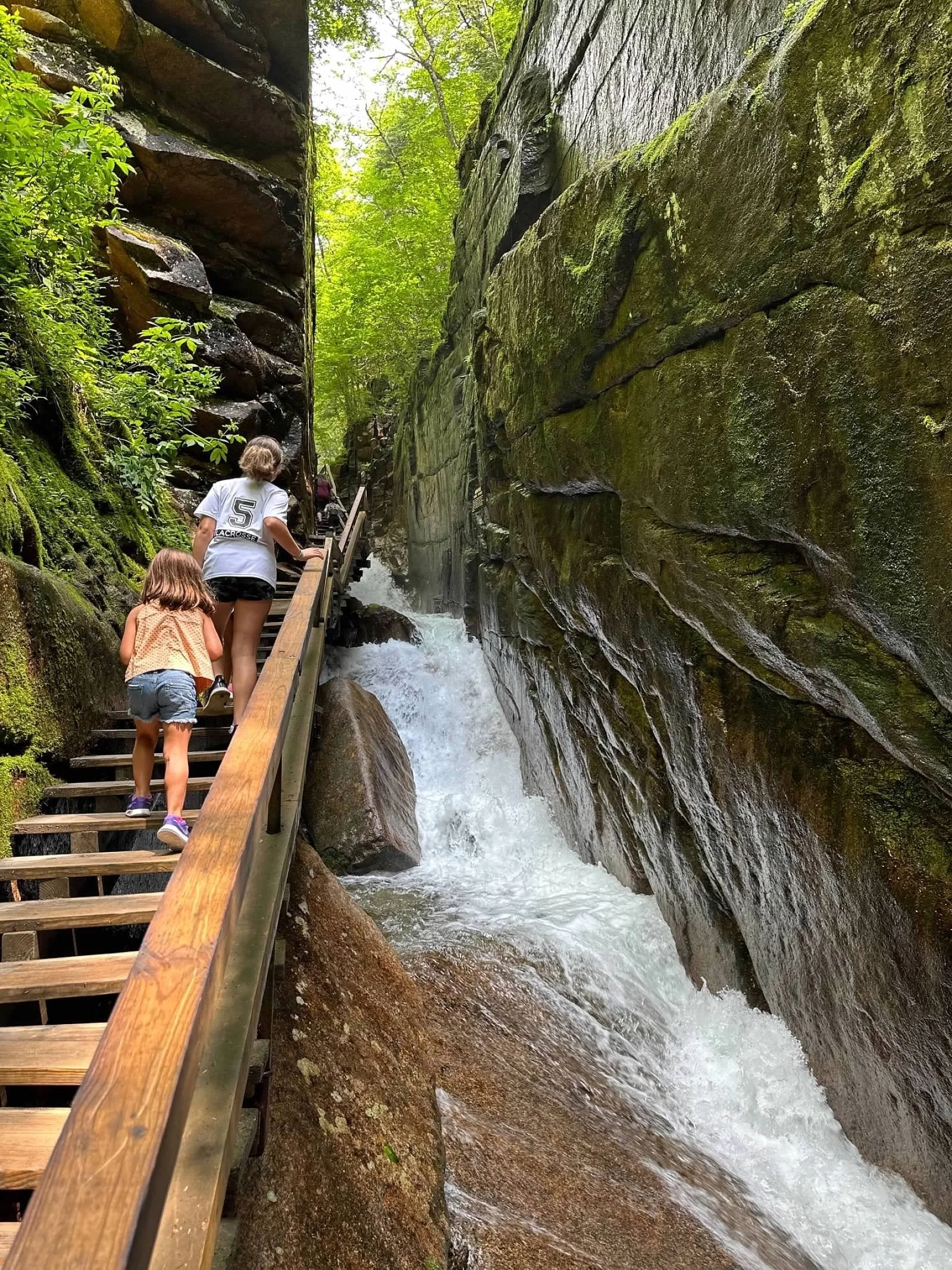 📍 Day 4. Get back on the road and continue north another 70 miles (1hr 40min) to Bretton Woods, NH, situated at the base of the stunning White Mountains. For an unforgettable pit stop, stop at the Flume Gorge located in Fraconia, NH, about 30 mins out from Bretton Woods. This 2-mile hike is suitable for little ones (our 5-yr-old did it) and carves through a granite gorge to the top of Avalanche Falls. Then settle in at the Omni Mount Washington Resort and let the kids play in the pool, roast s’mores, and play board games on the wraparound porch while you take in the gorgeous mountain view with a cocktail.